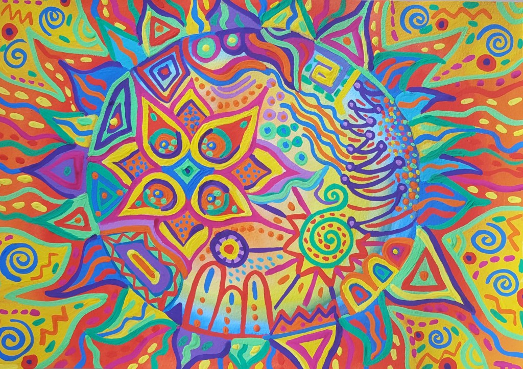 Mandala in Rainbow Colours 0 August 18, 2023 Written by Joanne Pedro ‘Mandala in Rainbow Colours’ is another colourful explosion, such as the last post I put up today. I used gouache (designer’s colours) to paint this one. Related
