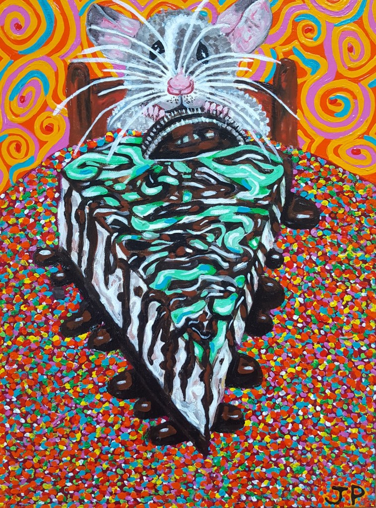 Oreo Cheesecake Rat 0 August 18, 2023 Written by Joanne Pedro Painting, acrylic on board, it’s a bit of fun to imagine a rat eating a mint chocolate Oreo cheesecake! Related