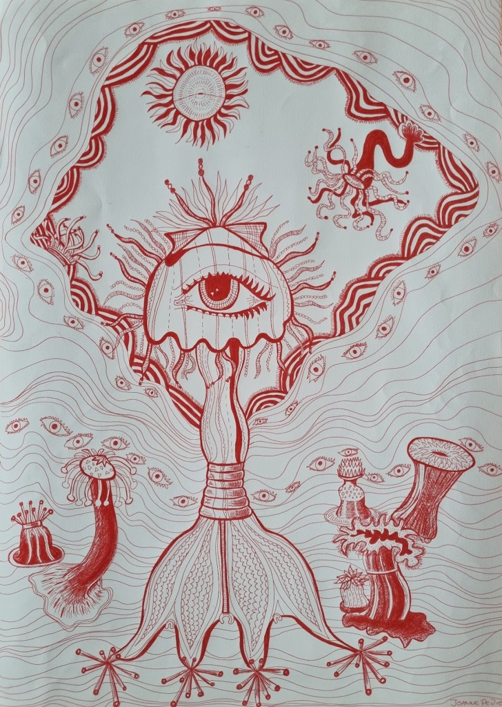 ‘Curious Creatures from the Sea’ is a drawing by me in red pen. It is influenced by the work of Ernst Haeckel, in particular drawings of sea anemones by Haeckel, who was a German zoologist, marine biologist and artist. Also, I like drawing eyes, so there are quite a few here in this work.