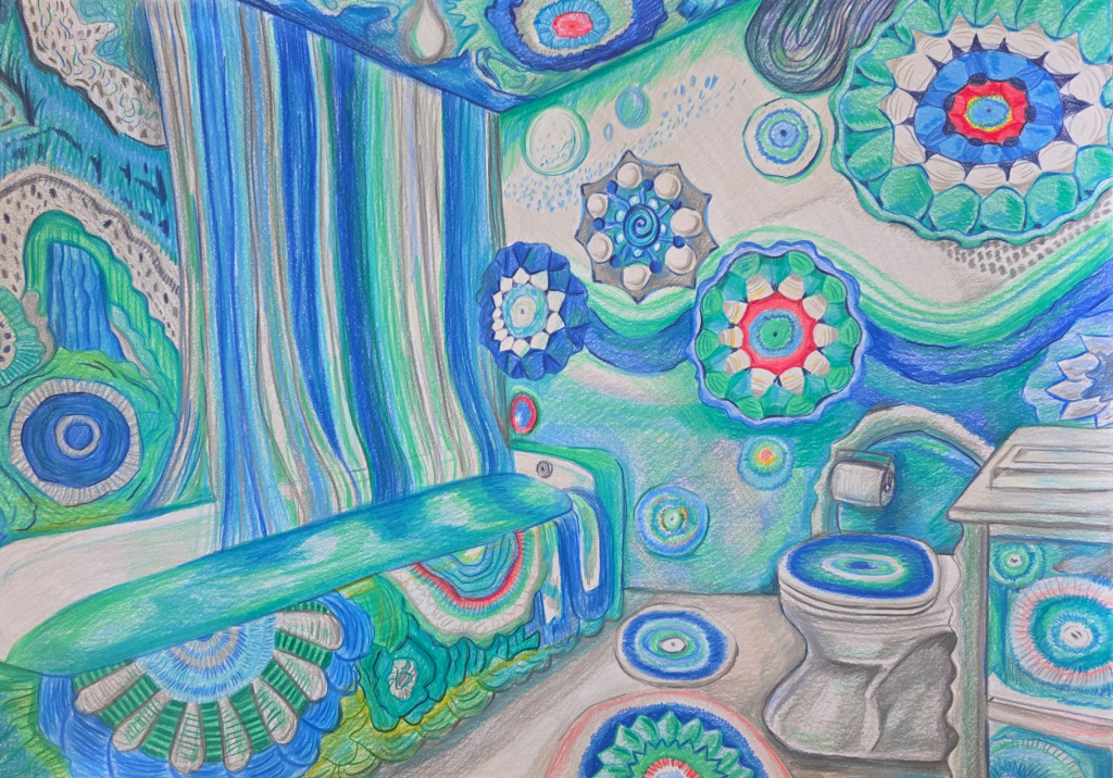 This drawing is of a fantasy bathroom, containing round images influenced by crochet doilies, draped over the bathtub, on the walls, floor and other places in the drawing, even on the ceiling. I added a waterfall over the bathtub, to give the drawing a surreal element in addition to the round images. I used a limited palette of blues, greens and greys, with touches of red and yellow. The drawing is on A2 paper using Faber-Castell Polychromos pencils.