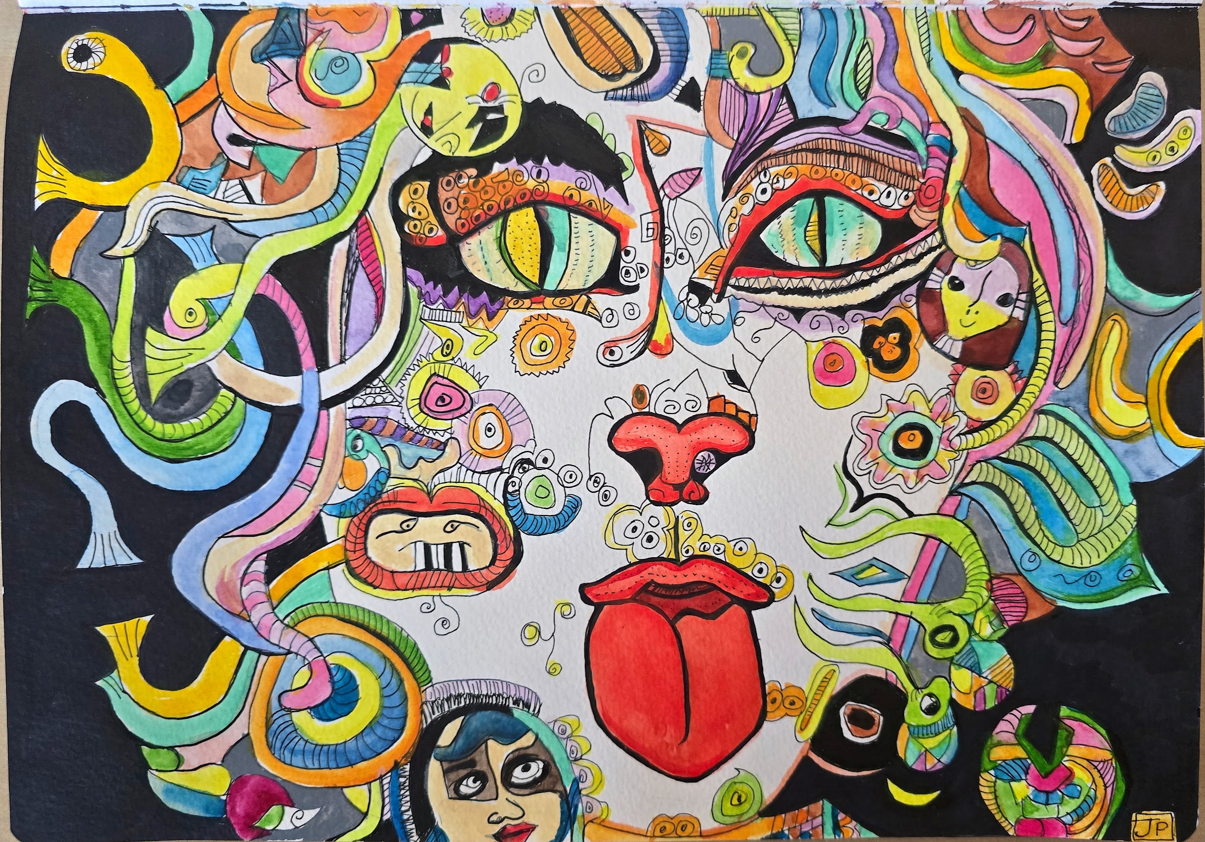 Medusa 0 November 23, 2024 Written by Joanne Pedro This is a colourful, whimsical portrait that has snake-like hair, with eyes and a nose similar to a cat. I used watercolours and a black Uniball pen in my A4 watercolour journal. Related