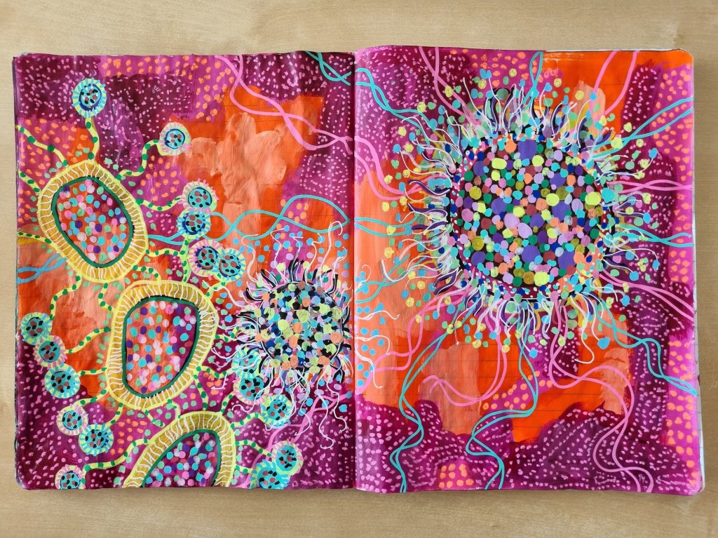 I created a book of images related to the Coronavirus Pandemic, starting around June 2021 and finishing in 2022. The book, a lined notebook, contains many paintings, drawings, collages, and photographs. This work is one of my favourites in the book. I titled my book ‘Let it Rip’ and gave this image the same title. I used acrylic paint in the background and Posca paint markers over the top of the painted background.