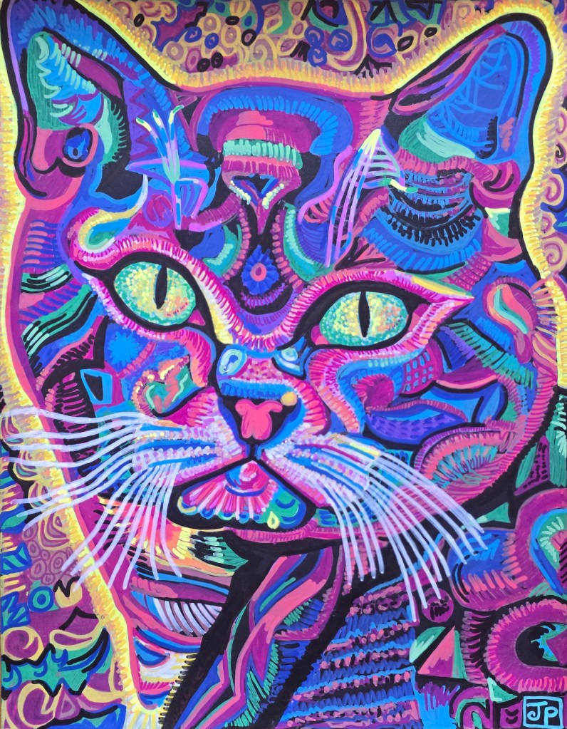 ‘The Cat’ is a portrait I created in various colours using both Sharpie Creative Markers and Posca Paint Markers. I only used a couple of Poscas due to the limited colour range of the Sharpies. I used Canson black paper here. I have been working in a fairly limited palette lately. However, this drawing is quite the opposite. It was enjoyable working on this one, and I didn’t expect it to be the colour explosion it turned out to be! I have three cats, and this one is closest to our tabby cat’s face. She tends to look at me like this sometimes, studying me, it seems like, with her hypnotic stare.