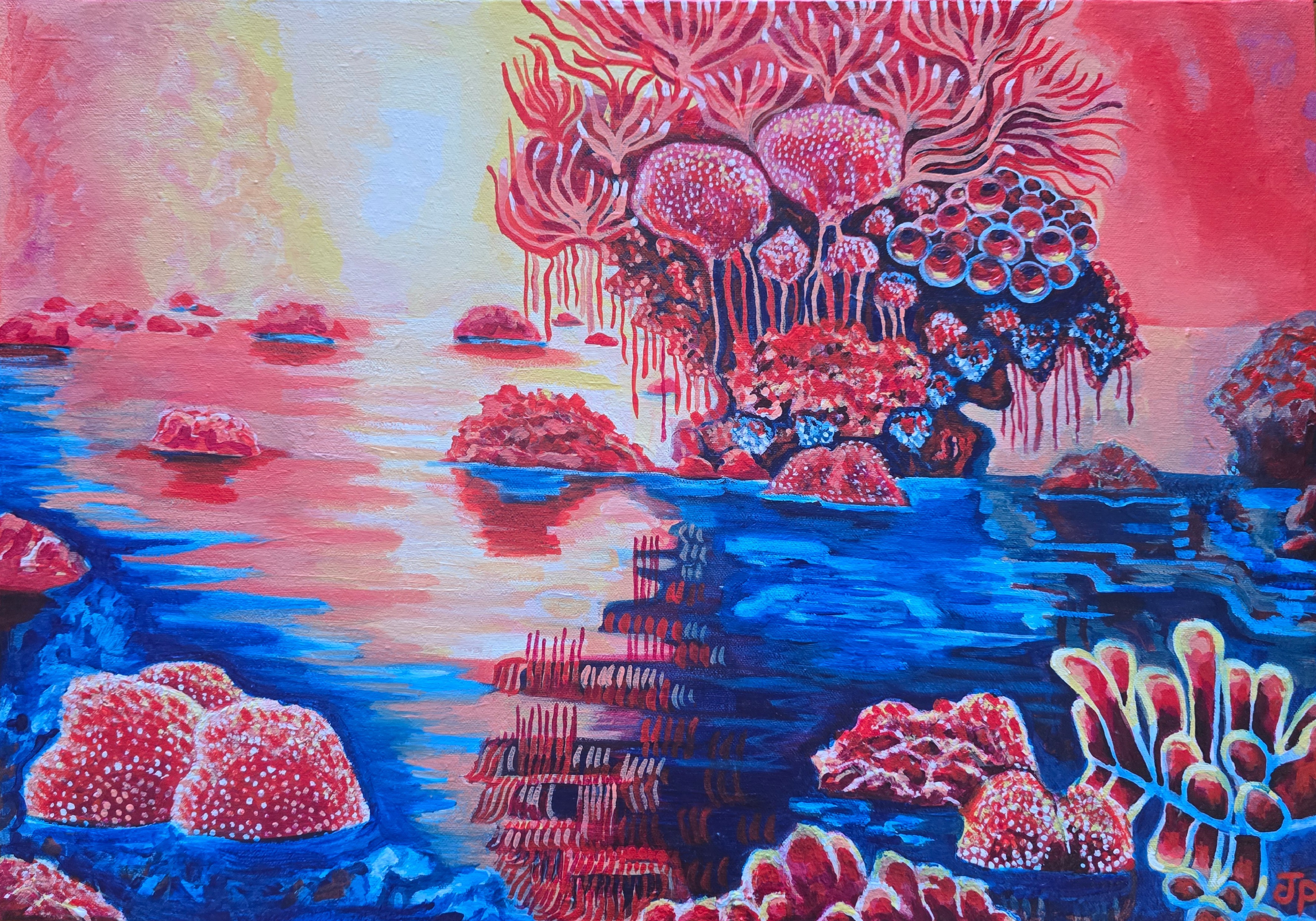 ‘Sea Garden’ is an acrylic polymer painting on canvas by me. It was initially based on coral. Coral-like rocky formations float above the surface of the water, rather than below it. I used a limited palette, which is not something I do often, as I usually saturate my paintings with many colours. I was mainly using reds and blue here, with some Naples yellow/reddish yellows. I wanted an otherworldly effect, of a place again which appears to be uninhabited, a strange world, somewhere that nobody has been to before.