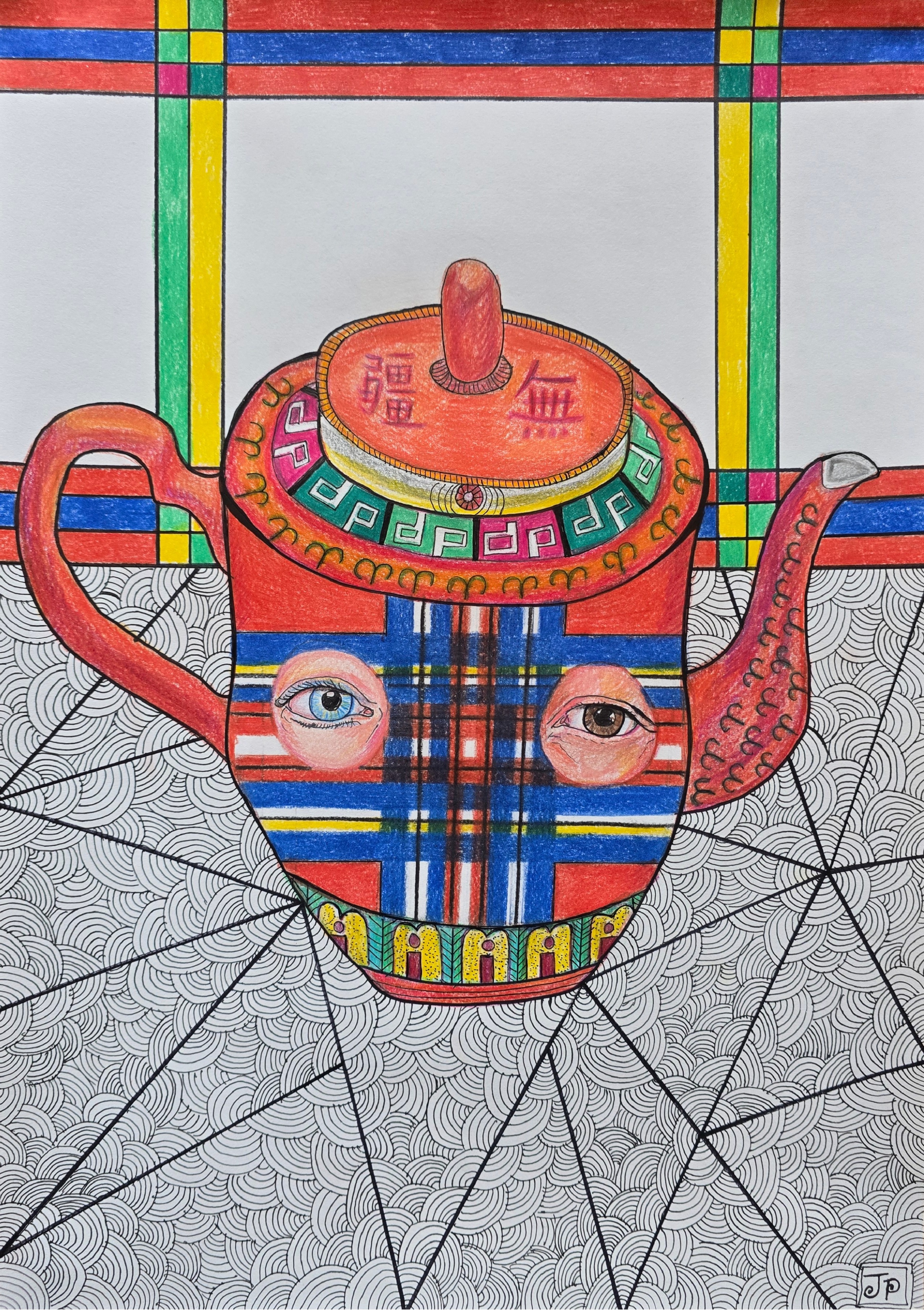 ‘Tartan Chinese Teapot’ is a quirky, fun drawing by me, which I finished on the last day of 2025. I used Faber-Castell Polychromos pencils and various black pens of different thicknesses. It has a cute look except for the eyes, which make it look rather ominous! There is a combination of Royal Stewart Tartan and Chinese characters on the teapot. The original teapot had Chinese characters originally where I drew the eyes, so I moved them to the lid instead.