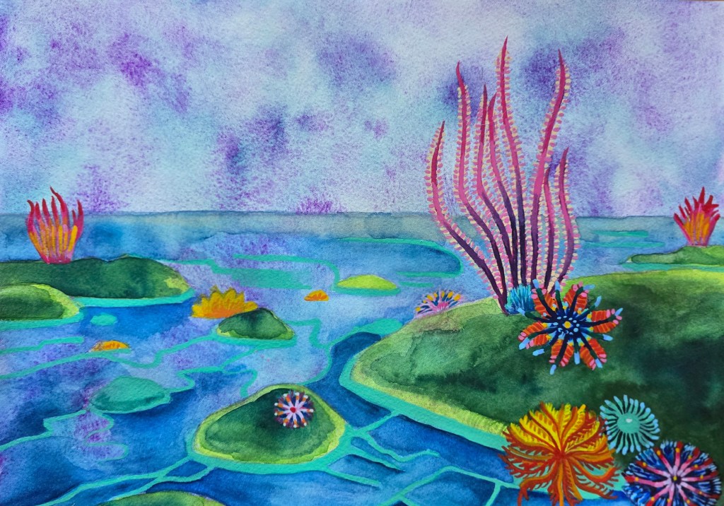 ‘Fantasy of Flowers in the Sea’, a watercolour painting by me with the use of granulating watercolours and Kuretake Gansai Tambi watercolours, also used with a gouache-like effect, which is particularly seen on the flower-like coral. Originally, I painted the A3 sheet of rough Arches paper with one colour of granulating watercolour, which came up violet and blue with its own shapes. I turned it into a seascape with floral-like coral formations.