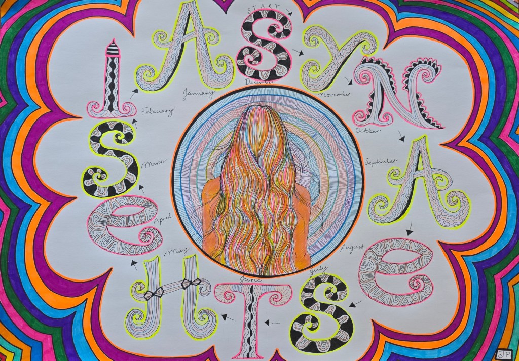 ‘Synaesthesia Self Portrait’ is a drawing of the letters in the word Synaesthesia, starting at the top of the drawing, going clockwise around from the letter “S” to the letter “A”. As in my earlier post, ‘Self Portrait with Synaesthesia Zodiac’ (11 May 2024), this recent drawing by me is also inspired by spatial-sequence synaesthesia. The months of the year are also written on the drawing, but they are anticlockwise. The figure in the middle, as in my other drawing, is the back of my head, with my hair visible. In spatial-sequence synaesthesia, the months (and certain dates) of the year seem to float around in space, occupying particular positions, and days of the week, decades, and years are also in particular positions as seen in the mind’s eye. I used marker pens, ranging from Uniball pens to Stabilo Pen 68 and Sharpie markers on A2 paper.