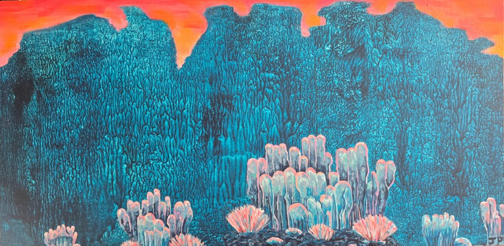 This is an acrylic painting by me on a linen panel. I used the technique of decalcomania in this work. Decalcomania was a technique used by other artists in the past, such as the Surrealist Max Ernst, as in his painting ‘Europe After the Rain II’ (1940-1942). Decalcomania creates random patterns and shapes in painting, and you can often see images in the patterns and shapes, such as faces and mountains (Pareidolia), which I saw here in my painting, which may be perceived differently than what someone else sees. The decalcomania makes this painting look like an alien world to me, with its unusual formations. I used a plastic sheet and a paint roller (brayer) to achieve this effect on the linen board, mostly with turquoise deep paint, which is transparent. I painted the cacti-like images along the bottom edge of the decalcomania, which resemble column cacti grouped together, using a limited palette.